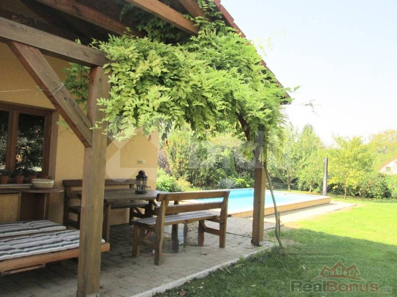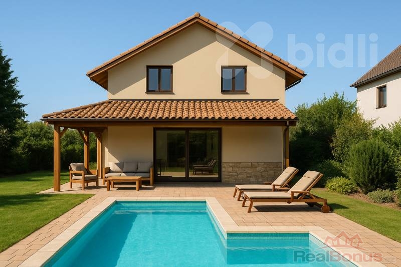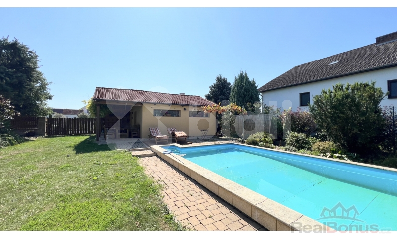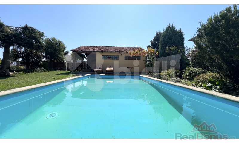 Na pozemku je zabudovaný 8,6 m dlouhý bazén s technologií a dvojgaráží, která byla zkolaudována v r. 2016