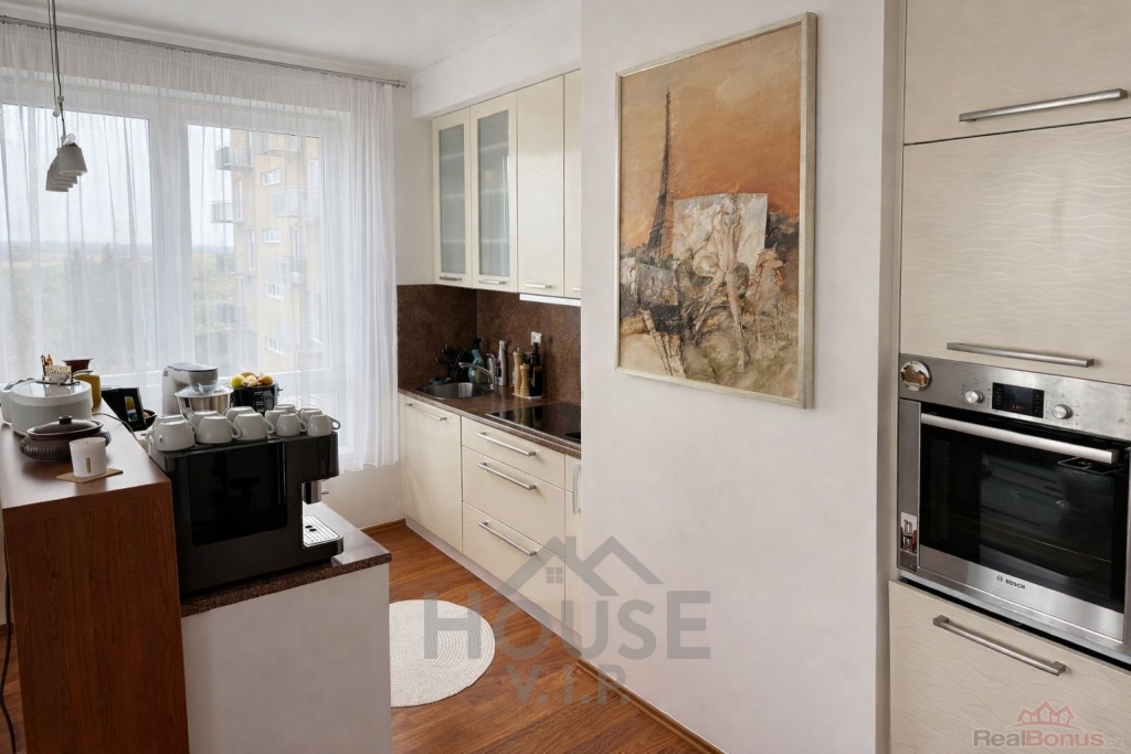 Byt je orientovaný na severovýchod a nabízí moderní interiér s kvalitní kuchyňskou linkou na míru. Najdete zde vestavěnou sklokeramickou varnou desku Bosch, digestoř Bosch, elektrickou troubu Bosch, myčku Miele a lednici s mrazákem Bosch. Součástí je také praktický kuchyňský ostrůvek. Na podlahách je položena kombinace lamina a dlažby, vytápění je řešeno ústředním topením.