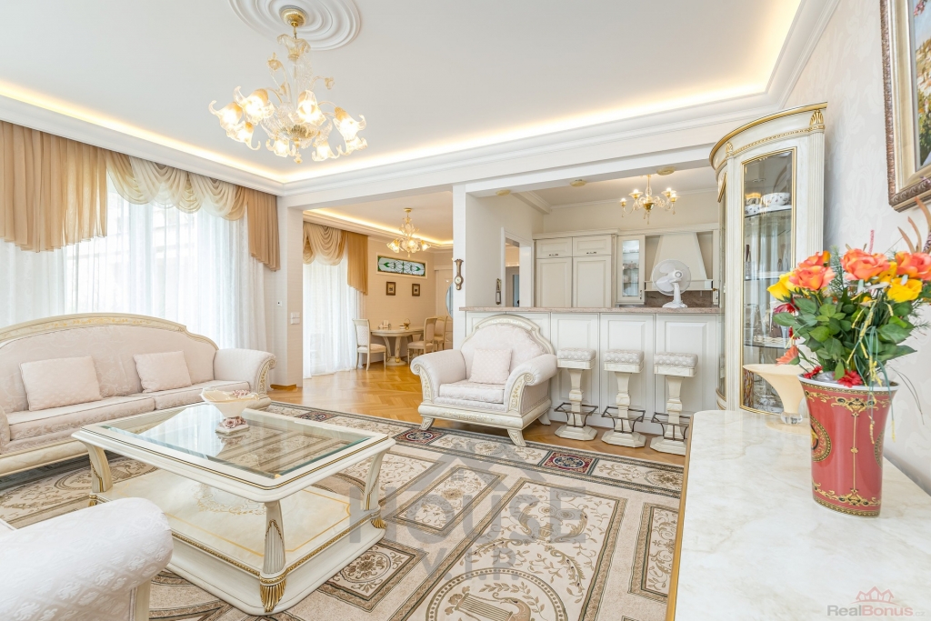 V přízemí se nachází velký krásný obývací pokoj se světlým italským nábytkem, který je propojen s jídelnou a kuchyní jako jeden komplex pro setkání a oslavy. Z jídelny je přístup na velkou krytou terasu a do zahrady.