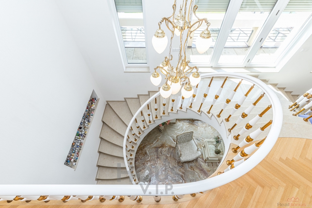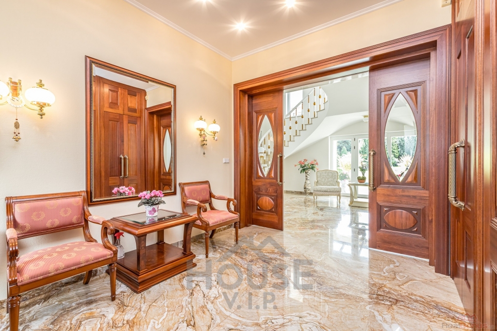 V přízemí domu se nachází velká vstupní hala se vstupem do prostorné šatny. Posuvnými inkrustovanými dveřmi se vchází do velké nádherné haly s mramorovým schodištěm do horního patra a přístupem do krásné zahrady, v obou místnostech jsou úžasné mramorové podlahy.