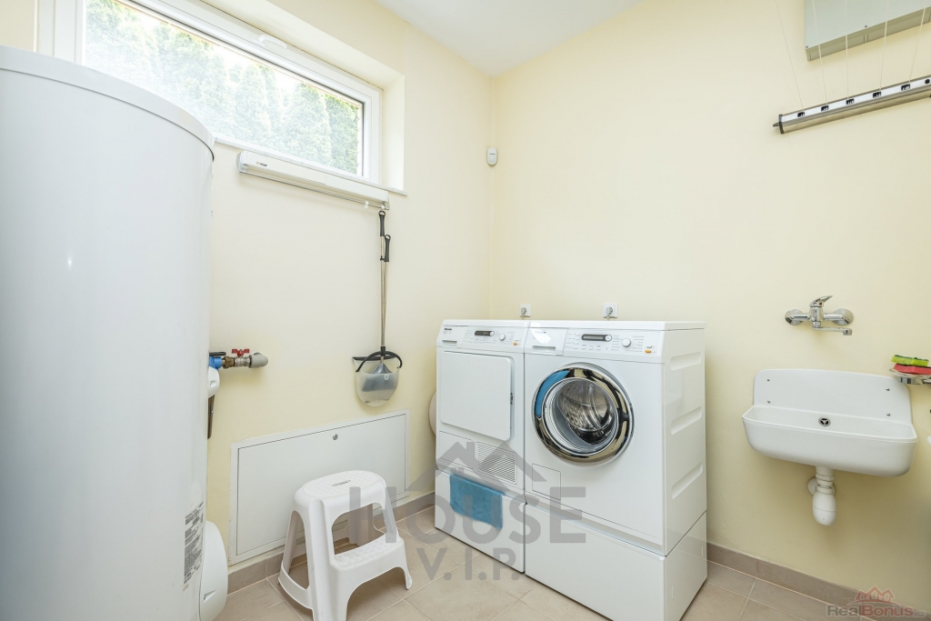 Dále se v patře nacházejí 2 velké zařízené ložnice, každá s vlastní koupelnou, a dobře vybavená pracovna s archivem, technické místnosti - žehlírna s úložnou skříní.
