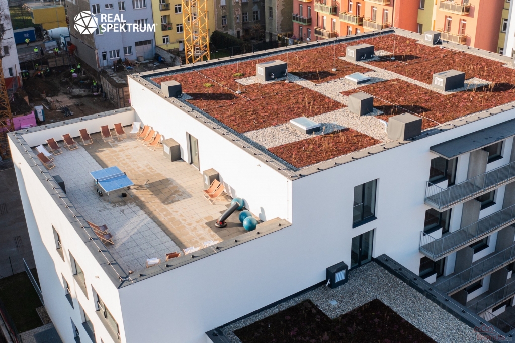 Součástí projektu je uzavřený vnitroblok, společné prostory pro rezidenty a zelené střechy, které přispívají k příjemnému prostředí celého domu. Velkou výhodou je, že se jedná o novostavbu v již dokončeném projektu, takže kupující přesně ví, co kupuje a nemusí čekat na dokončení výstavby.