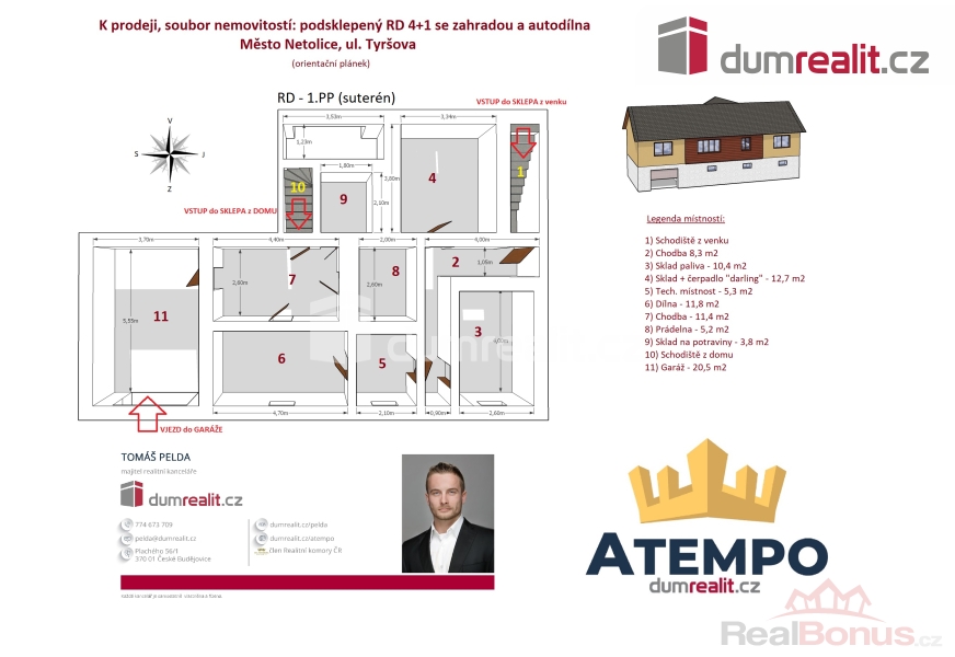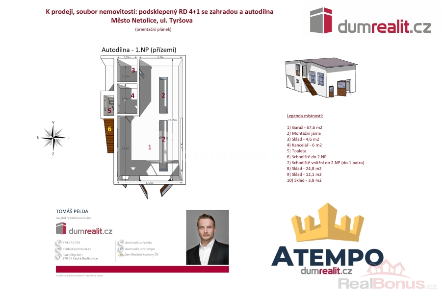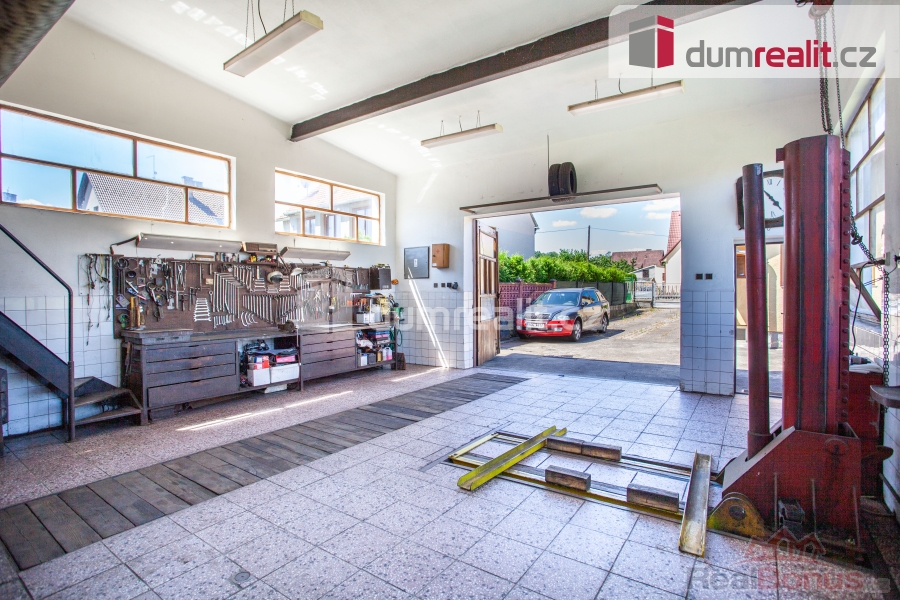 Cena je včetně provize RK a právního servisu. Více informací Vám poskytne makléř Tomáš Pelda., Dumrealit.cz Vám zprostředkuje koupi souboru nemovitostí na jednom místě v klidné lokalitě, a to ve městě Netolice v ul. Tyršova: 1) poctivě postavený podsklepený zděný rodinný dům 4+1 s pergolou, bazénem, skleníkem a udržovanou zahradou; 2) AUTODÍLNA se zdviží, montážní jámou, sociálním zázemím, sklady a zpevněnými plochy na parkování. 1) RD je zděný a je připraven k okamžitému nastěhování. Dispozici jednotlivých podlaží a objektů naleznete na orientačním plánku mezi fotografiemi. Dům je variabilní, stejně tak i AUTODÍLNA, kterou lze zrekonstruovat na obytné prostory. RD má železobetonový strop mezi suterénem a 1.NP. Strop mezi 1.NP a půdou je zateplený dřevěný. Krov ve výborném stavu je pobitý prkny s eternitovými šablonami bez jakéhokoliv nedostatku a zatékání. Okna jsou dřevěná s dvojskly. Vchodové dveře jsou původní dřevěné. Garážová vrata v RD jsou automatická. Vytápění RD je kombinované s otopnou soustavou se "samotížkou": A) plynový kotel; B) kotel na tuhá paliva; C) kachlová kamna s výměníkem; D) vamberecká elektrická kachlová kamna. RD je napojen na plyn, elektřinu, městskou kanalizaci a veřejný vodovod + vlastní studna a darling. 2) AUTODÍLNA: zděný objekt s dřevěnými manuálními vraty, původní dřevěné vchodové dveře. Vybavení autodílny na fotografiích je součástí prodeje. Více informací o nabízených nemovitostech Vám poskytne realitní makléř Tomáš Pelda z realitní kanceláře A TEMPO fungující pod ochrannou známkou dumrealit.cz. Zajistíme Vám financování a veškerý právní servis. Ev. číslo: 652259. Energetický štítek: G