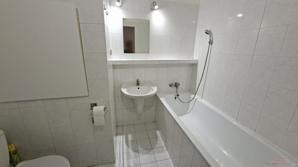 Zděná koupelna je starší, spojená s WC, v pěkném stavu, vybavená pračkou.