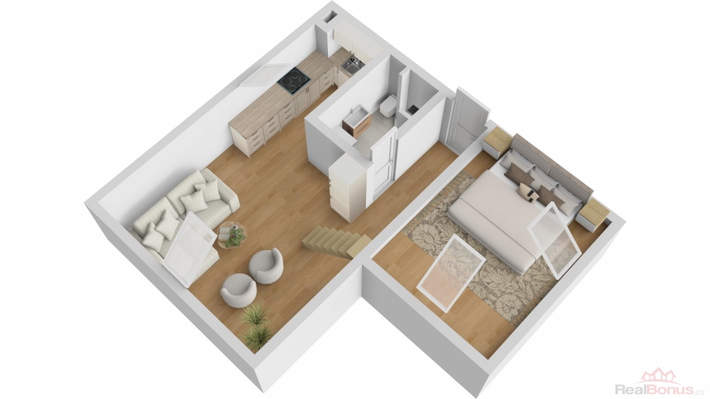 Byt díky mezonetovému řešení působí velmi vzdušně a připomíná malý městský loft. Spodní část tvoří obytný prostor s kuchyňským koutem a koupelnou, v horním podkrovním patře se nachází ložnice.