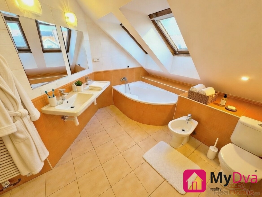 - Podkroví ? klidová zóna: koupelna s vanou, sprchovým koutem, dvojitým umyvadlem, WC a bidetem. Dále ložnice s klimatizací, další pokoj a samostatná šatna s vestavnou skříní. Ze šatny je vstup do půdního prostoru ? díky třem střešním oknům je možné ho v budoucnu využít jako pracovnu.