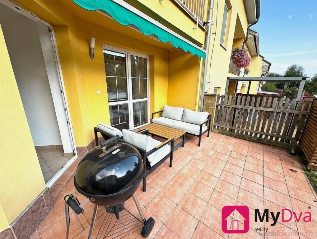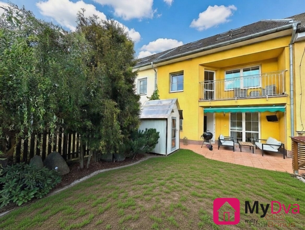 Za domem najdete udržovanou zahradu o ploše 124 m2 s terasou, markýzou a zahradním domkem na nářadí ? ideální prostor pro relax i rodinné grilování. Před domem jsou dvě parkovací stání a vjezd do garáže s automatickými vraty.
