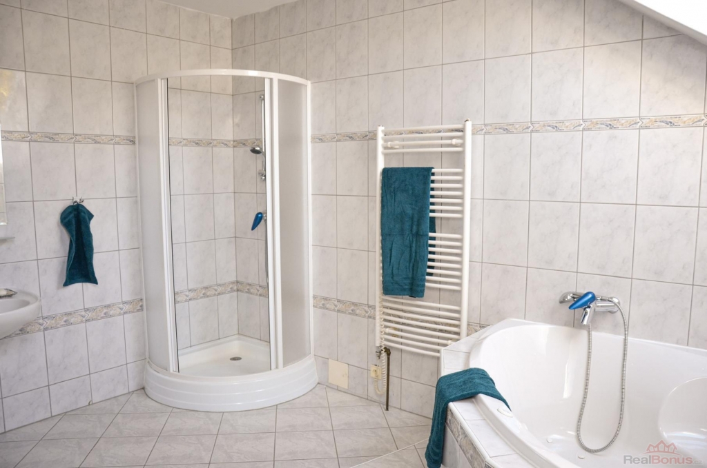 Vířivé vany v koupelnách, příprava na saunu, kondenzační plynový kotel, garážová vrata a brána na dálkové ovládání.