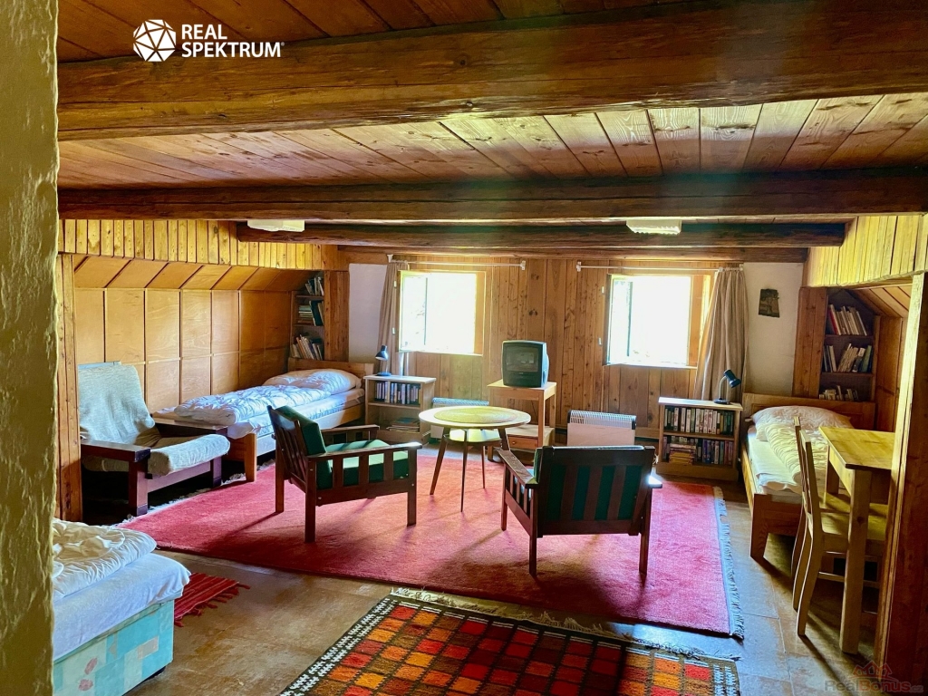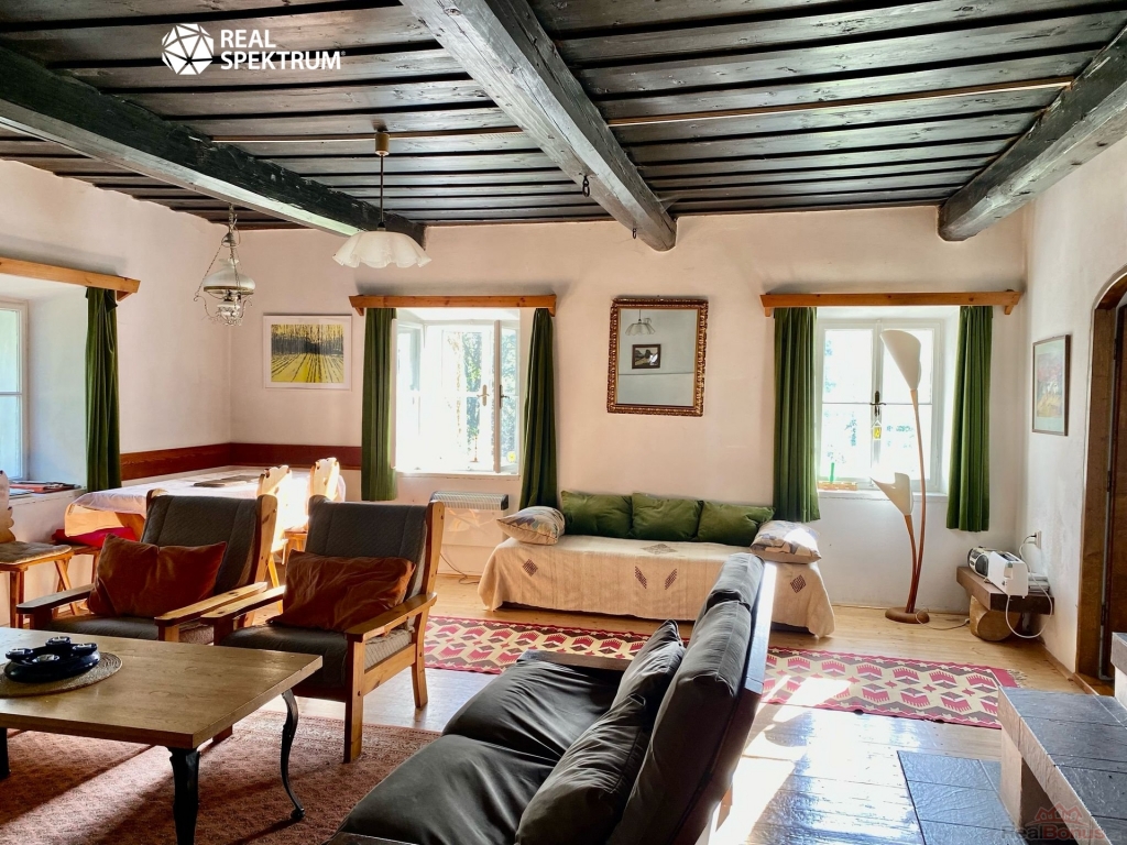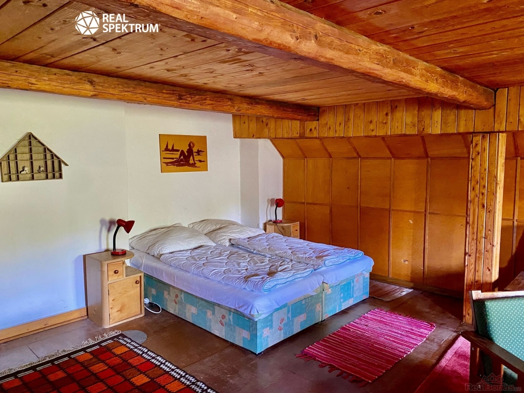 Nemovitost je přízemní selské stavení ve tvaru ?U?, Z prostorné chodby je přístup do kuchyně, velké jizby ? obývacího pokoje s krbovými kamny, ložnice č. 1, ložnice č. 2 a dvou koupelen, po schodech se dostane do podkroví, kde je ložnice č. 3 a půdní prostory skýtající možnost rozšíření - vestavby. Dále se z chodby dostanete na vnitřní dvorek o výměře cca 5x5m a také do stodoly a technické místnosti.