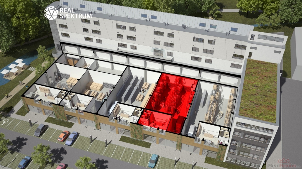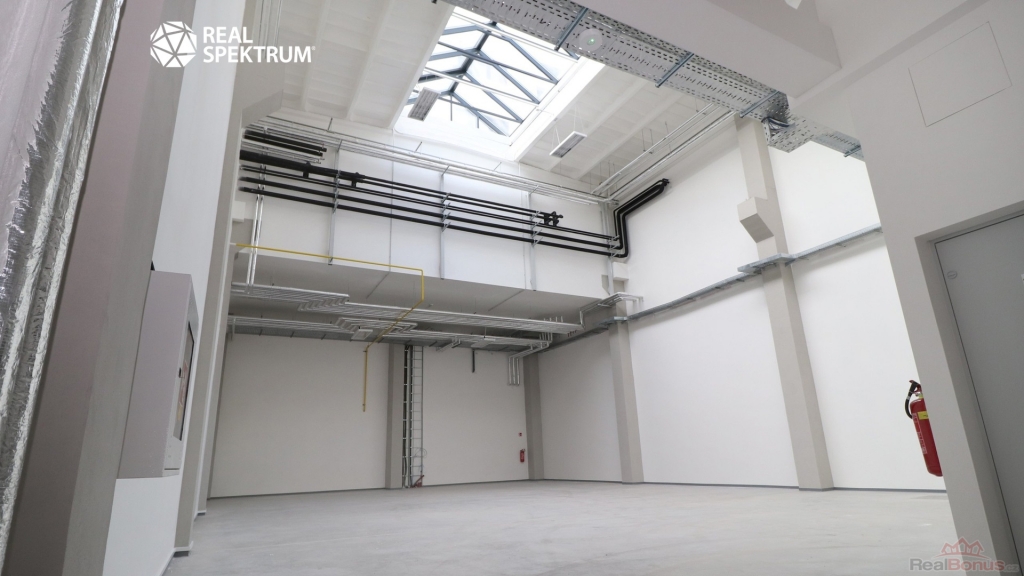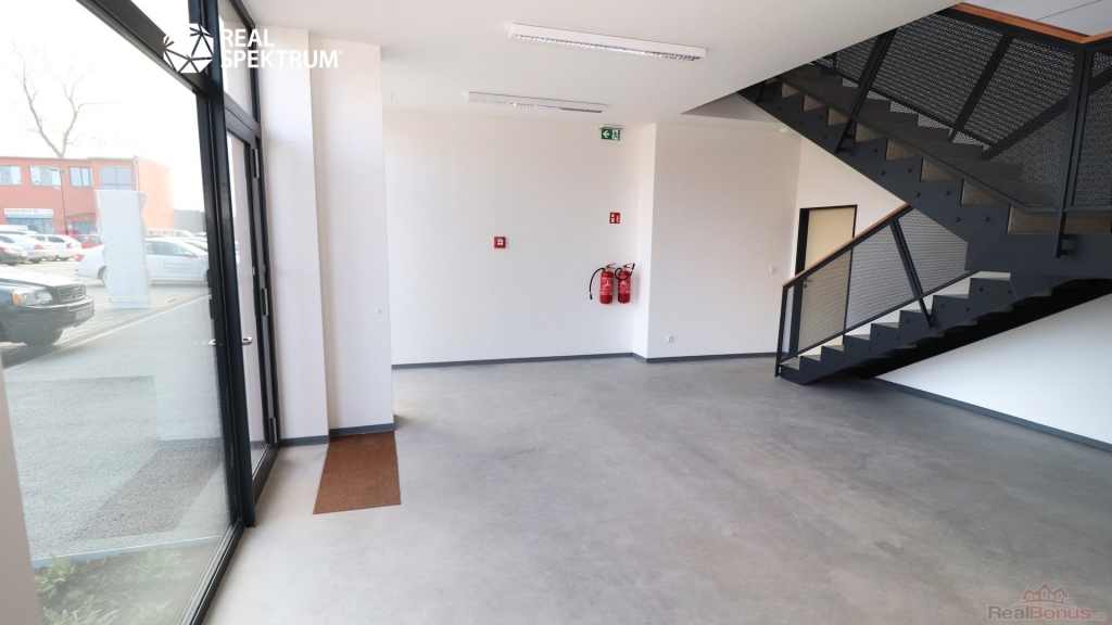 Celek se skládá ze dvou flexibilních jednotek s celkovou plochou 645 m2, z toho přibližně 480 m2 skladové nebo výrobní části a 165 m2 kancelářského zázemí. Dispozice umožňuje efektivní rozdělení provozu ? přízemní část je určena především pro skladování, logistiku nebo lehkou výrobu, zatímco administrativní část nabízí komfortní zázemí pro management a zaměstnance. Díky velkým proskleným průčelím mohou prostory zároveň sloužit jako showroom, výdejní místo nebo zákaznické centrum.