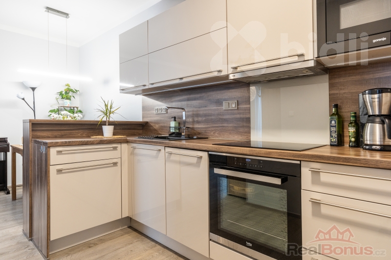 Vybavení: Designová kuchyně, vestavěné úložné prostory