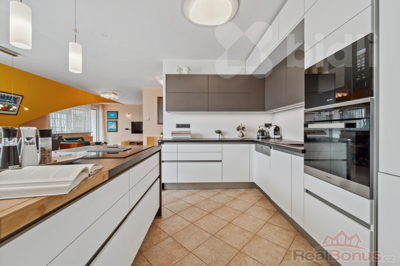 V bytě byla minulý rok instalována nová kvalitní a praktická kuchyňská linka s dostatkem úložného prostoru, vestavěnými spotřebiči a ostrůvkem na vaření se spodním odsáváním. Součástí kuchyně je také samostatná spíž pro uskladnění potravin.