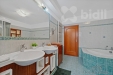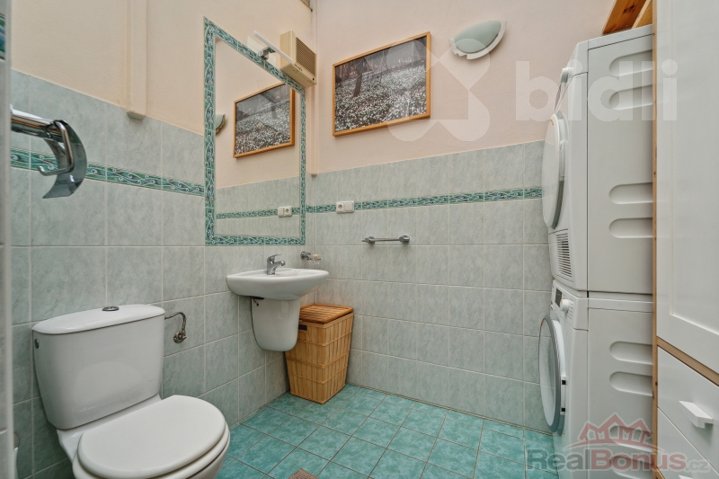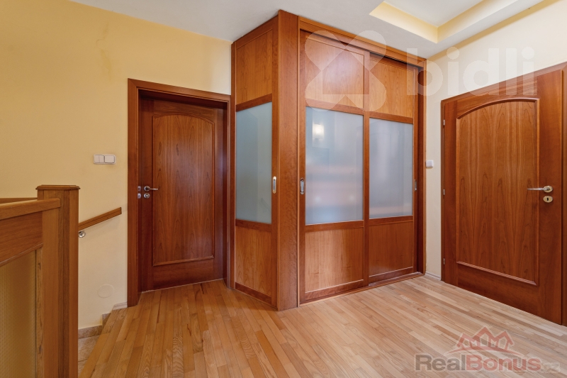 Po schodišti se dostanete do klidové části bytu. Najdete zde prostornou koupelnu s vanou, dvěma umyvadly, masážním sprchovým koutem a přístupem do technické místnosti s druhým WC, pračkou, sušičkou, umyvadlem a klimatizací. Ložnice má vlastní šatnu a rovněž klimatizaci. Velká okna přinášejí krásný výhled i dostatek denního světla, okna v ložnici jsou navíc vybavena elektronickými předokenními žaluziemi. Dětský pokoj je světlý a útulný. Chodba disponuje vestavěnými skříněmi.