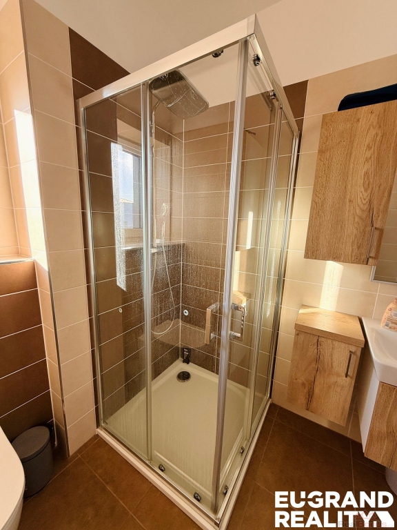 Koupelna je vybavena koupelnovým nábytkem vyrobeným na míru, který nabízí dostatek úložného prostoru a praktické využití.