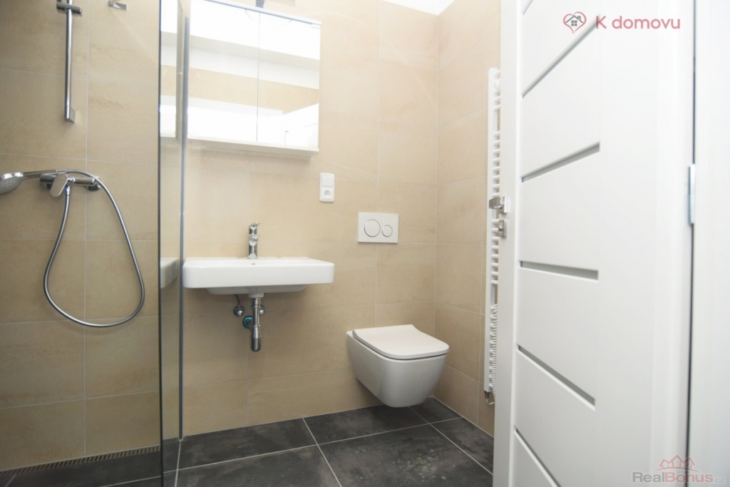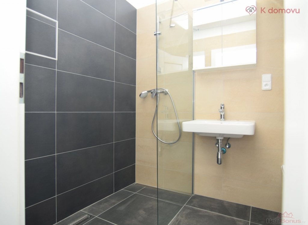 Bytová jednotka se nachází ve 4. nadzemním podlaží sedmipodlažního nového bytového domu s výtahem. Z předsíně se vchází rovnou do prostorného pokoje s kuchyňským koutem, který je zařízen moderní kuchyňskou linkou vybavenou indukční varnou deskou s digestoří, elektrickou troubou, lednicí s mrazákem. Koupelna je vybavena bezbariérovým sprchovým koutem, závěsným WC a pračkou kombinovanou se sušičkou. K bytu náleží sklepní kóje o výměře 3 m2. Byt je vybaven rekuperační jednotkou. K relaxaci lze využívat malou zahradu, která vznikla ve dvorním traktu.