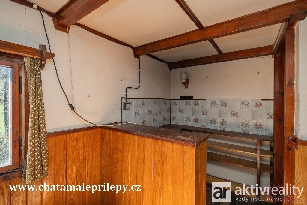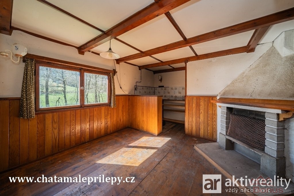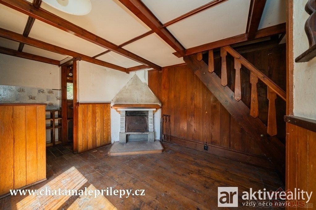 V přízemí vás čeká předsíň, malá komora a útulný obývací pokoj s koutem pro kuchyňku a s rustikálním krbem, kde si můžete užít teplé večery. Po krátkém výstupu po schodišti se dostanete do podkroví, které bude pravděpodobně sloužit jako ložnice, kde vás čeká klidný spánek a odpočinek po dni stráveném procházkami nebo výlety do okolní přírody. Do chaty je zavedena elektřina. Na chatu navazuje malá kůlna, kde je i místo pro chemické WC.
