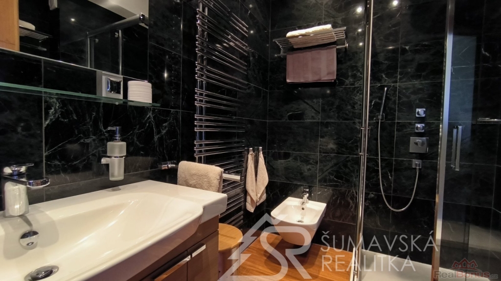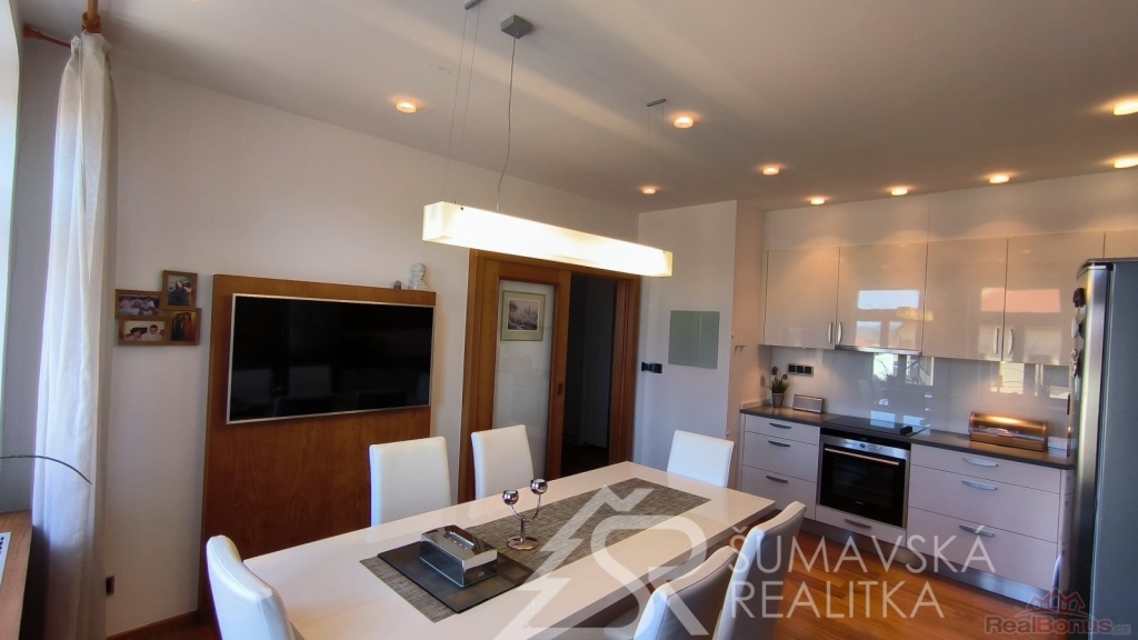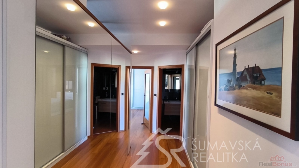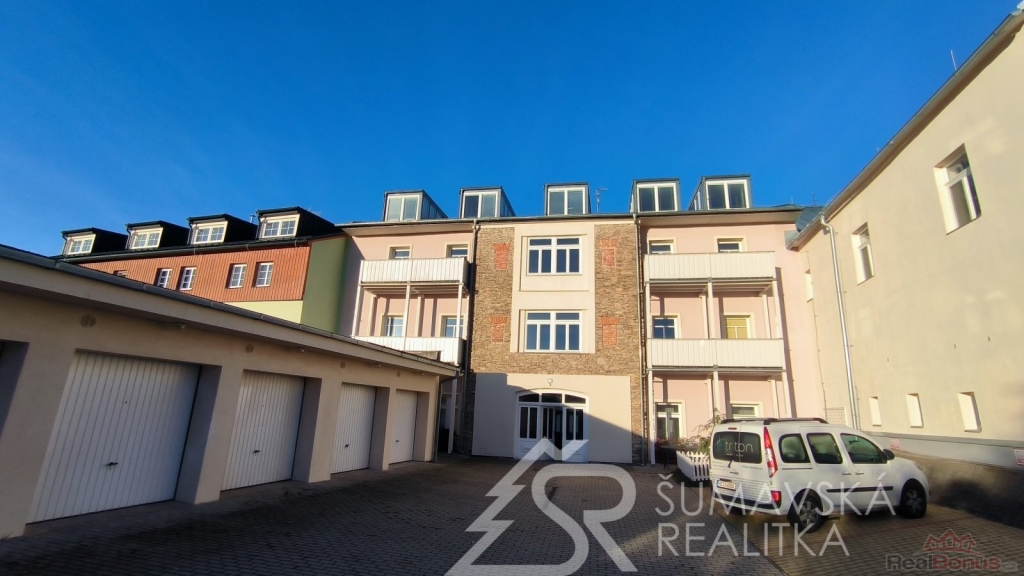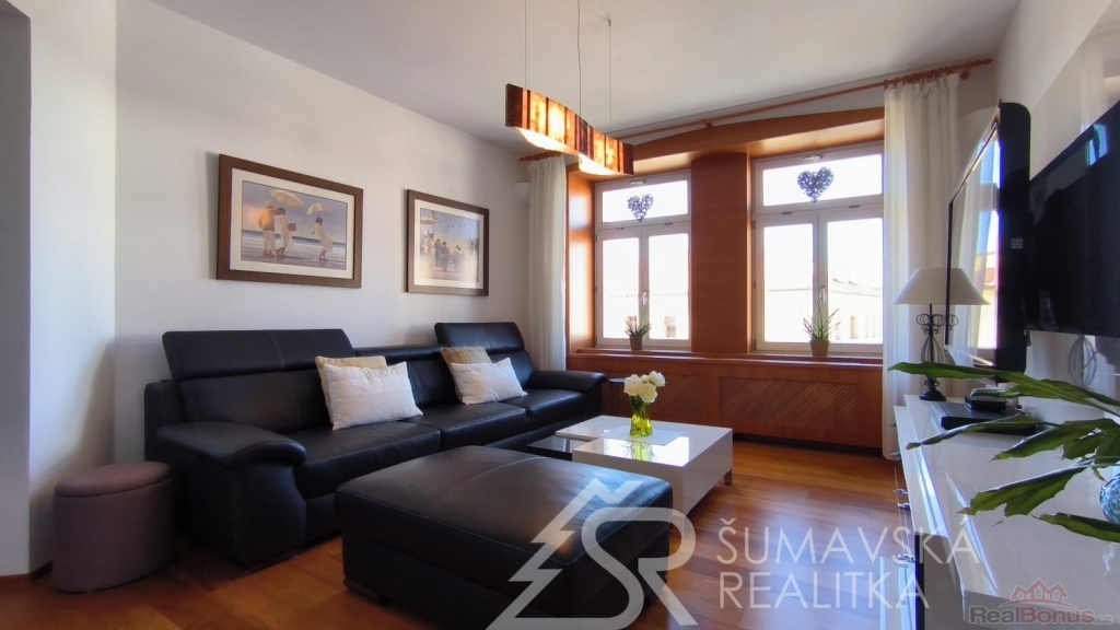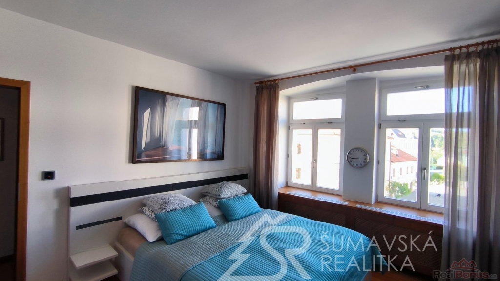 Přímo na gotickém náměstí v Kašperských Horách se nachází zrekonstruovaný dům v jehož 2.NP je nabízený apartmán o podlahové ploše 120 m2, který vznikl spojením dvou sousedních bytů. Nádherný výhled na námětí s kostelem sv.Markéty a radnicí je opravdu nezapomenutelný a neokoukatelný. Byt prošel kompletní modernizací v roce 2020, je nadčasově designově zařízen a v tomto stavu se také prodává. V prostorné předsíni jsou velkorysé vestavěné zrcadlové skříně a vstupy dveřmi z masivu do třech ložnic, obývacího pokoje, kuchyně s jídelnou a dvou koupelen s mramorovým obkladem. Ve větší ložnici je umístěna i infrasauna. Na jedné stěně v kuchyni je zachovalé původní kamenné zdivo, které dodává místnosti punc historie. Vybavení však hovoří o moderní době, kdy zařizovací předměty jsou od firmy Siemens (sklokeramický sporák, vestavěná trouba, digestoř) a myčka Bosch. Krásné jsou i dřevěné kryty radiátorů a velkoformátové dřevěné parkety z teaku v obytných místnostech. Veškerý nábytek byl tvořen na míru. V jedné z koupelen je vířivá vana a bidet. K bytu jsou k dispozici na chodbě dvě samostatné praktické komory a ve vnitřním dvoře parkovací stání.