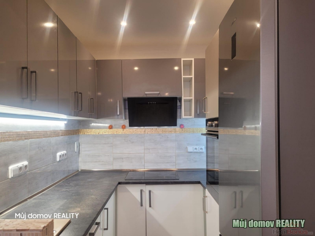 Byt je částečně zařízený k dispozici je plně vybavená kuchyňská linka, lednice, sporák, trouba a dostatek úložných prostor. Chybí pouze postel a sedací souprava.