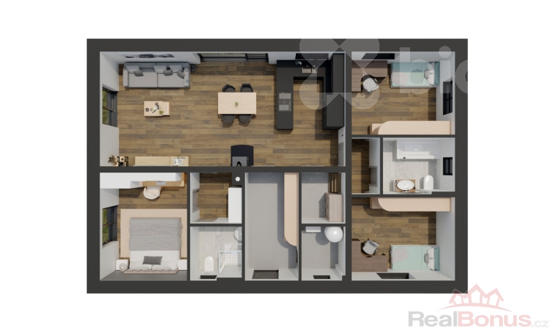 Dům bude realizován ve vysokém standardu - vinylové podlahy, moderní sanita (SAT, SIKO), plastová okna s izolačním trojsklem, antracitová střešní krytina, interiérové dveře, elegantní obklady Rako Betonico, příprava pro kuchyňskou linku a vybavené koupelny. O vytápění se postará tepelné čerpadlo typu vzduch-voda od značky Willy, což znamená nízké provozní náklady a energetickou efektivitu. Změny v dispozičním řešení i standardech jsou možné - dům lze přizpůsobit vašim přáním ještě před dokončením.