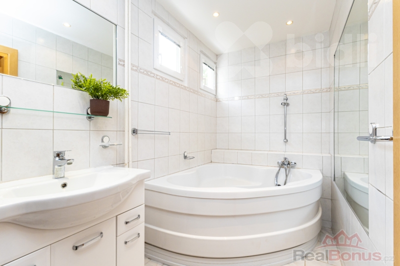 -kuchyně s americkou lednicí LG, jídelna se vstupem na terasu a zahradu, pokoj pro hosty s vestavnými skříněmi, obývací pokoj s krásným trámovým stropem, 2 koupelny s rohovými vanami a 2 toalety, z toho jedna samostatná,