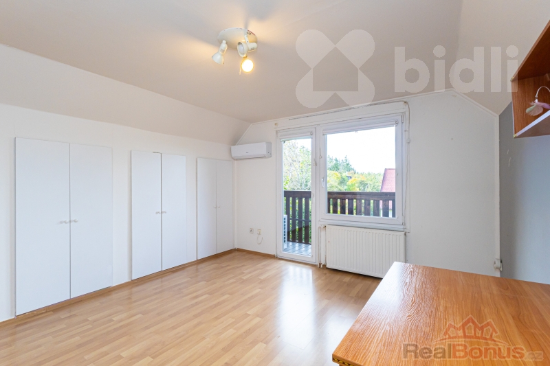 -2 pokoje s vestavnými skříněmi, jeden s balkónem, atypická ložnice s obloukovým oknem, vestavnými skříněmi a výhledem do lesa
