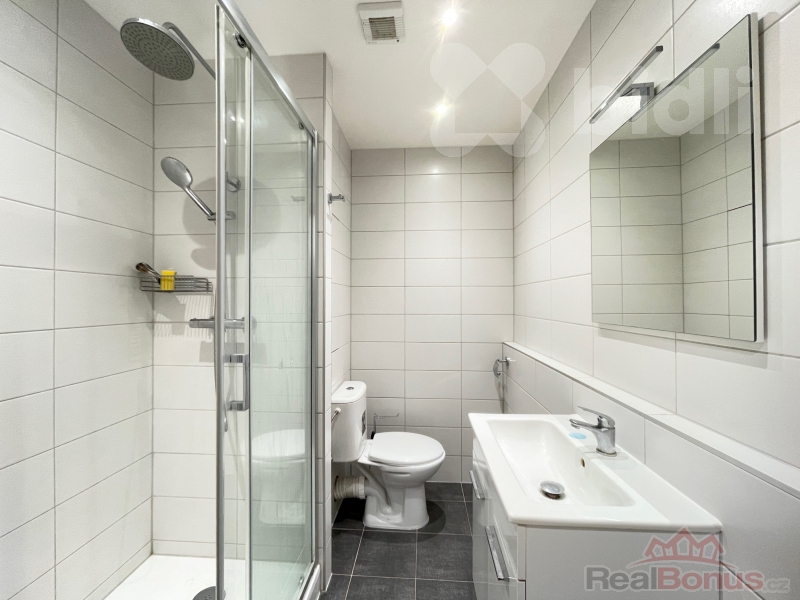 Krásná koupelna s prostorným sprchovým koutem a WC.