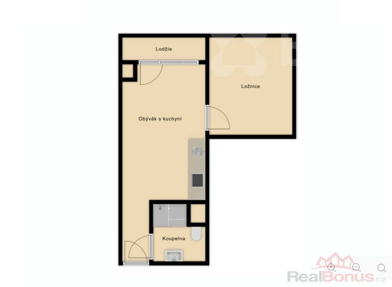 Byt tvoří obývací pokoj s kuchyňským koutem, samostatná ložnice, koupelna se sprchovým koutem a WC.