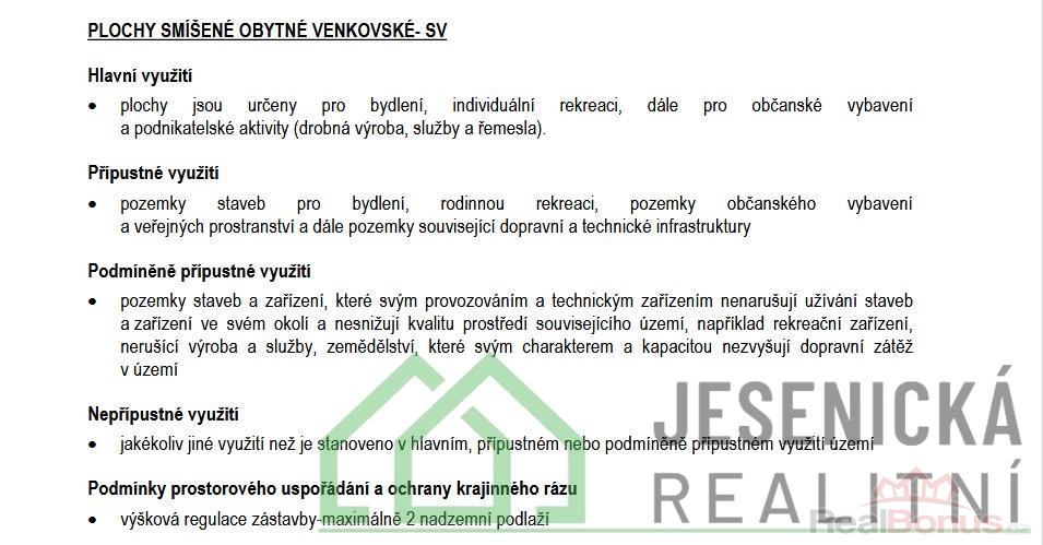 První část tvoří stavební parcela o celkové výměře 2 937 m and sup2;, která se nachází v dolní části pozemku. Podle územního plánu je vedena v kategorii SV plochy smíšené obytné, kde je hlavním využitím výstavba rodinných domů nebo objektů pro rodinnou rekreaci s výškovou regulací maximálně dvě nadzemní podlaží.