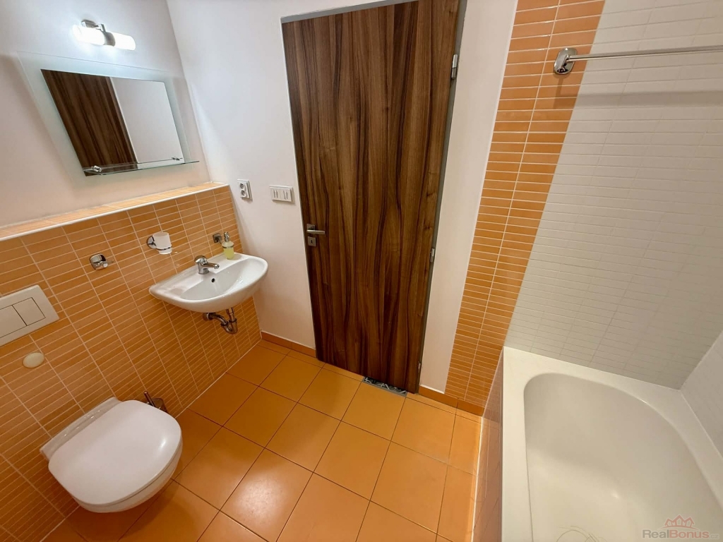 ? koupelna s WC (vana, umyvadlo, zrcadlo s poličkou, závěsné WC, el. topný žebřík, chromový program, větrák)