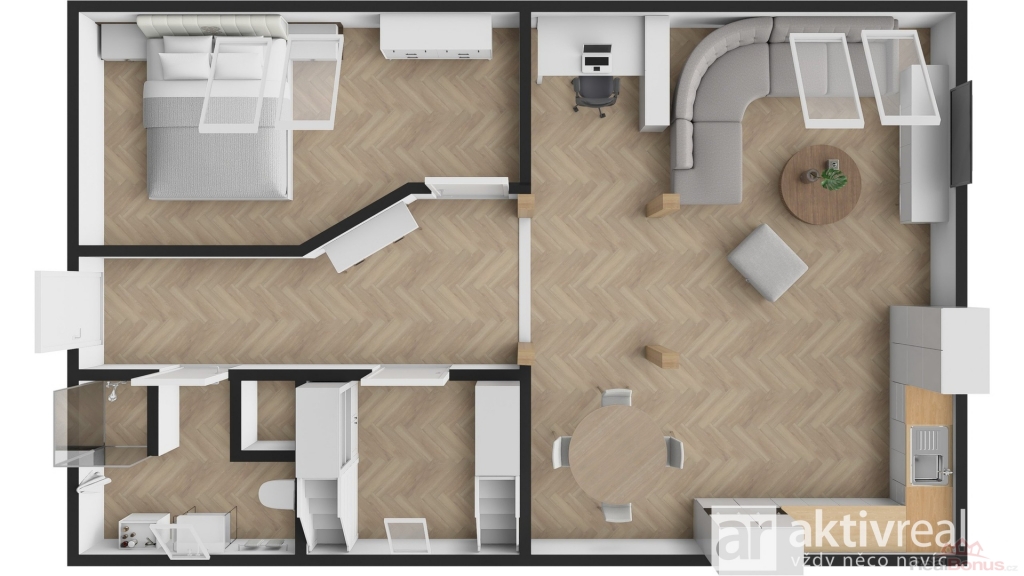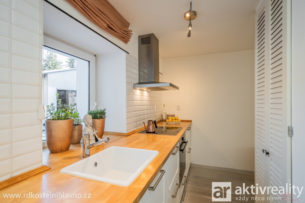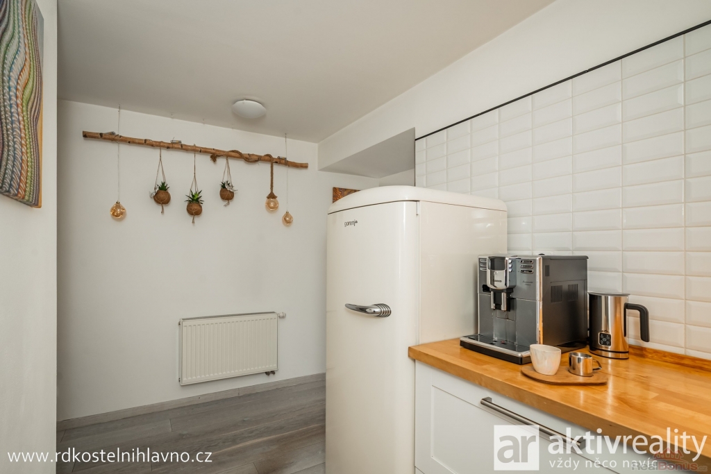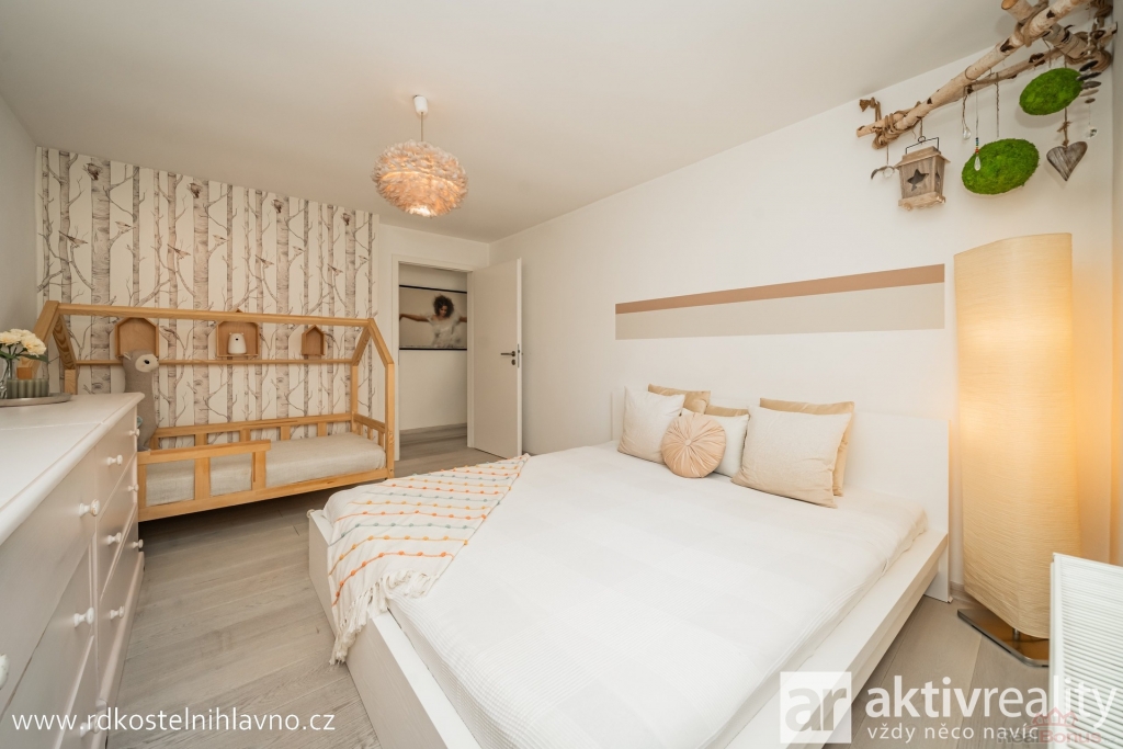 V přízemí vás přivítá světlá a prostorná vstupní chodba se skrytou šatnou, která nabízí dostatek úložného prostoru. Z chodby se dostanete do hlavní obytné části ? kuchyně, která je vybavena vestavěnými spotřebiči a prakticky oddělena od obývacího pokoje komínem s krbem. Dále je zde ložnice a další pokoj, který lze využít například jako dětský nebo pracovní. Koupelna je laděná do moderního stylu, s designovou betonovou stěrkou, která je téměř bezúdržbová, a vedle ní se nachází samostatná toaleta.