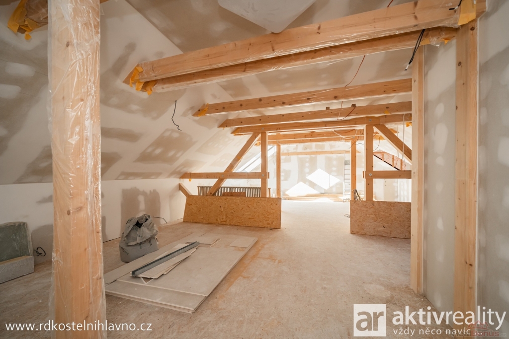 Do podkroví, které bylo vestavěno v lednu 2024, vejdete venkovním schodištěm ze zahrady. Tento prostor je připraven na dokončení samostatné bytové jednotky 2+kk cca 73 m2. Je zde prostor pro koupelnu se sprchovým koutem a toaletou, dále pak pro ložnici a obývací pokoj, který může být moderně propojen s kuchyní.