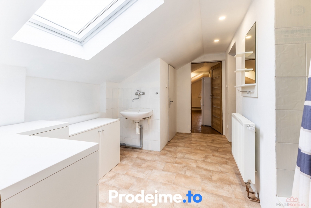 Podkroví bylo upraveno k bydlení a nabízí dispozici 2+1 o velikosti 70 m2. Najdete zde kuchyni, obývací pokoj se vstupem na lodžii, ložnici, samostatnou toaletu a vstupní chodbu s atypicky řešeným sprchovým koutem v rohu místnosti. Pro plnohodnotné dvougenerační bydlení bude vhodné zde doplnit samostatnou koupelnu. Součástí obytného podkroví je také půda, která poslouží především jako úložný prostor.