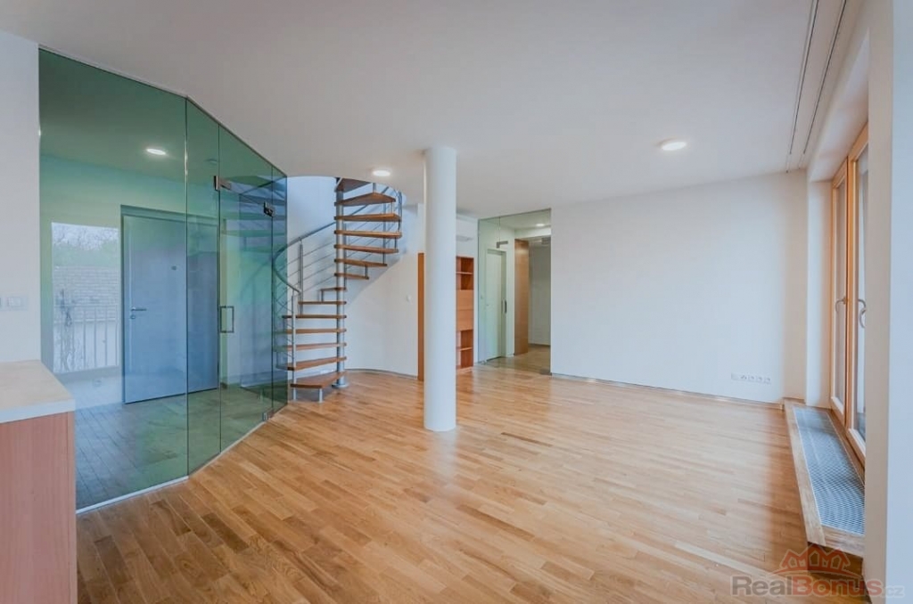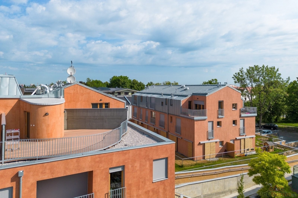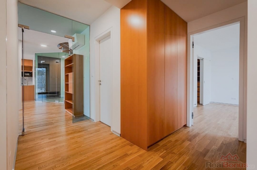 Nabízíme k pronájmu prostorný byt o dispozici 4+kk v novostavbě z roku 2022 v ulici Na Návsi v Dolních Měcholupech. Byt má užitnou plochu 114 m2 + lodžie 4,3 m2 + terasa 40,7 m2. K bytu náleží dvě garážová stání v suterénu objektu. Celý byt je vybaven klimatizací.