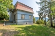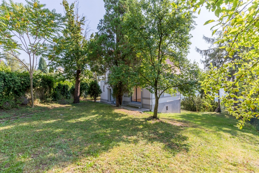 Na zahradě je několik starších stromů, kamenné zídky, starší dřevěný zahradní domek.