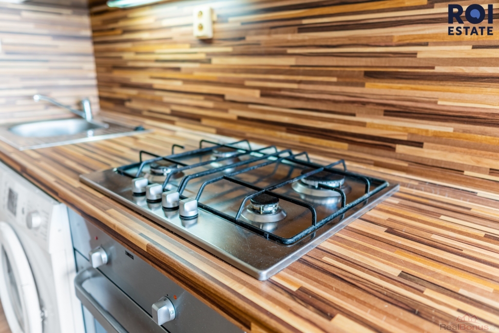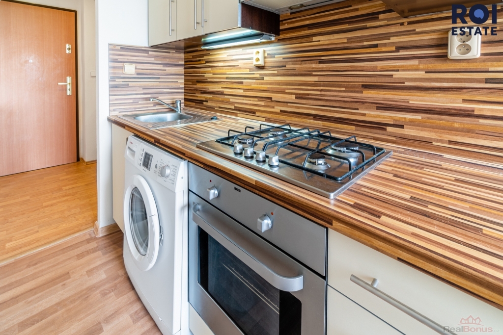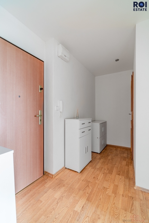 Po vstupu do bytu se ocitnete na poměrně prostorné chodbě, odkud se dostanete jak do koupelny se sprchovým koutem a toaletou, tak do kuchyně či pokoje. Kuchyň s jídelnou disponuje kromě moderní linky i kombinovanou lednicí a pračkou zasazenou do linky. Do pokoje bez problémů vměstnáte postel i sedací soupravu. S úložným prostorem si taky nemusíte dělat starosti, protože zde pro vás máme i šatní skříň.