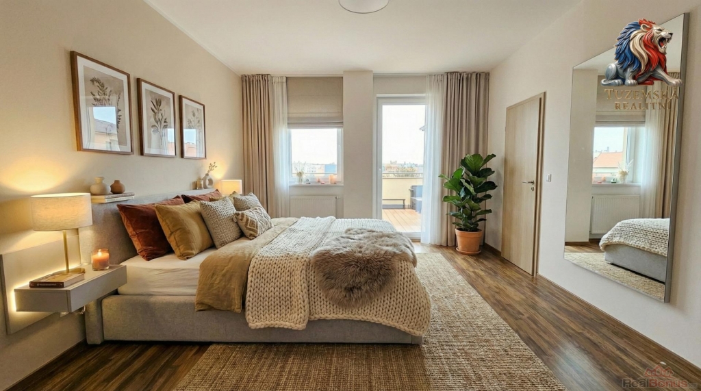 Velká terasa 30m2 s úžasným výhledem je opravdu středobodem bydlení v tomto výjimečném bytě. I Vaše první kroky při osobní prohlídce povedou jistě sem. Troje francouzská okna a to z obýváku, kuchyně a ložnice Vás na ni prostě stále zvou.
