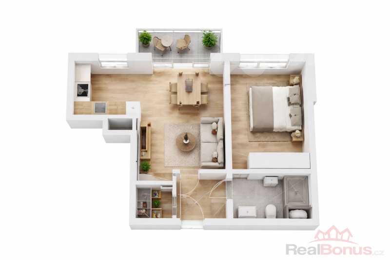 Srdcem bytu je obývací pokoj s kuchyňským koutem, který vytváří otevřený a vzdušný obytný prostor pro každodenní život. Ložnice nabízí dostatek soukromí a klidu. Praktickým benefitem je také komora, kde je připravené místo pro pračku i sušičku - detail, který v běžném provozu oceníte každý den.
