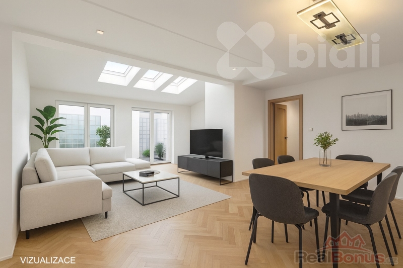 Celková užitná plocha činí 159 m2, z toho terasa zaujímá zhruba 25 m2 a sklep 4 m2. Byt prošel v roce 2001 kompletní rekonstrukcí zahrnující podlahy, dveře, kuchyňskou linku, koupelnu, topení i všechny rozvody. V roce 2009 byla část terasy odborně zastřešena a elegantně propojena s obývacím pokojem, který se tím výrazně zvětšil. Atmosféru domova doplňuje plně funkční krb a pro větší komfort i bezpečnost je k dispozici vestavěný trezor s klíčem a kódem.
