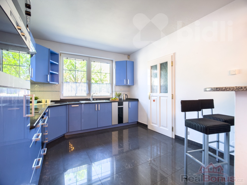 Dominantou domu je velkorysý obývací pokoj s krbem a otevřeným stropem, který celému prostoru dodává jedinečnou vzdušnost a dostatek přirozeného světla. Na obývací část plynule navazuje moderně řešená kuchyň s kvalitními vestavěnými spotřebiči a praktickou samostatnou spižírnou.