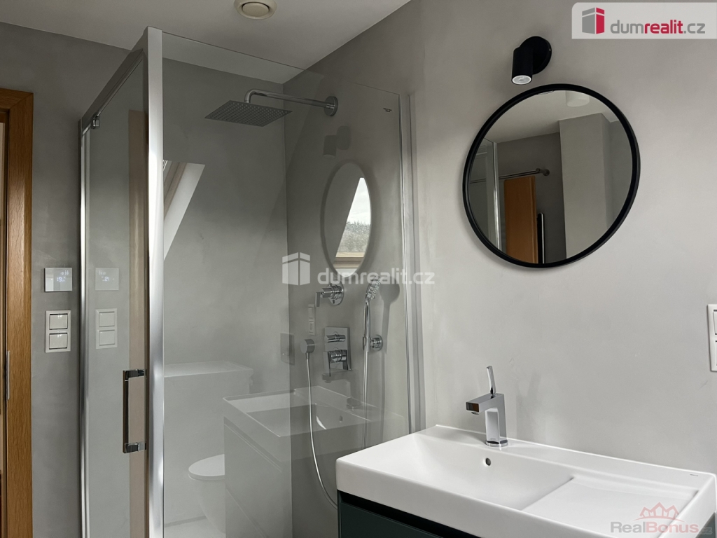 Další pokoj je přístupný z předsíně kdy se po schodech vchází do otevřeného prostoru s výrazným oknem, prostorný pokoj, který rozdělen na část s pracovnou a knihovnou a dále na další ložnici. V této části bytu je k dispozici druhá koupelna se sprchovým koutem, umyvadlem a toaletou.