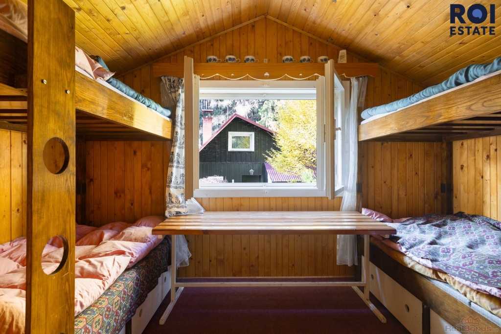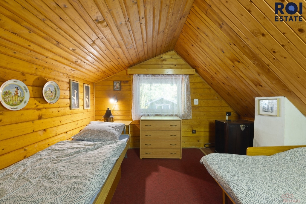 V přízemí se nachází útulný obývací pokoj s krbovými kamny se schodištěm do podkroví, dále kuchyně s elektrickým sporákem, koupelna, WC a také prostorná sauna. V patře pak najdete dva prostorné pokoje s krásným výhledem do okolní přírody. O vytápění se starají kamna na tuhá paliva, která spolehlivě vyhřejí celý objekt. Voda je čerpána z vlastní studny a ohřev zajišťuje elektrický bojler. Odpady jsou svedeny do jímky.