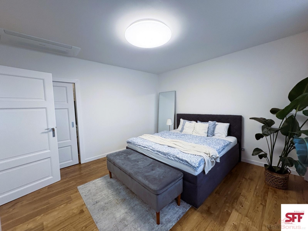 Dispozice bytu zahrnuje vstupní chodbu, moderní kuchyňský kout plynule navazující na obývací pokoj, prostornou ložnici, velkou šatnu, která slouží i jako komora, a koupelnu s toaletou a sprchovým koutem.