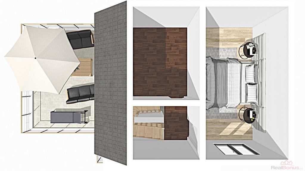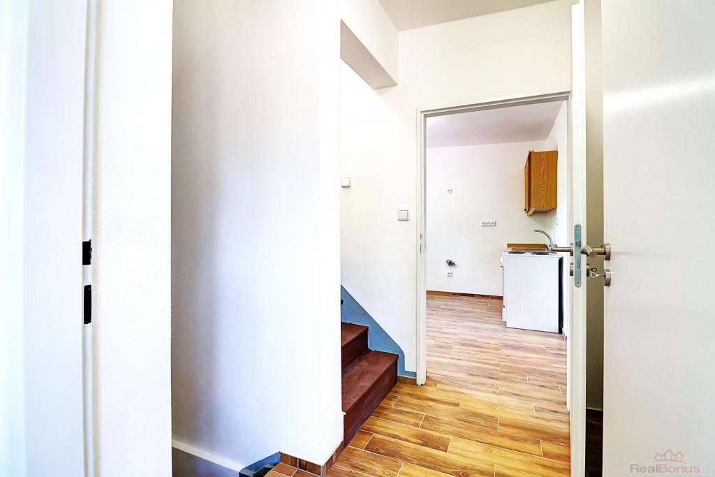 V obytném podlaží domu je zádveří, chodba, kuchyně, pokoj. V podkroví je umístěný druhý pokoj a půda. Koupelna, WC, komora - špajz jsou umístěny v suterénu. Na spodní část domu navazuje garáž, jejíž střecha slouží zároveň jako terasa. Dům je napojen na vodovod, plynovod, elektřinu, odpady do septiku. Na dům navazuje dvorek a zahrádka. Dům lze užívat jak k trvalému bydlení, tak i jako chalupu, Financování domu je možné i úvěrem ze stavebního spoření nebo hypotékou - zajistíme. Nezávazná konzultace s naším finančním specialistou - zdarma. Můžeme zajistit i financování pro klienty, kteří nedostanou úvěr v bance.