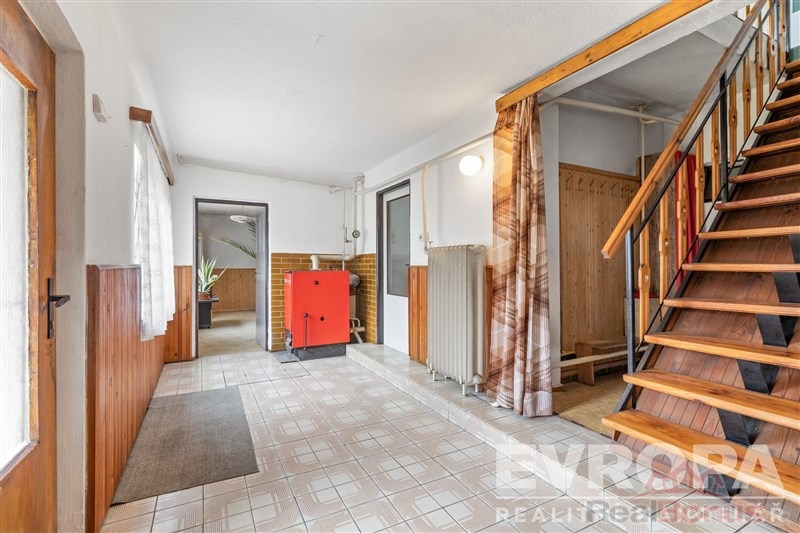 V přízemí najdete útulné zázemí s kuchyní, koupelnou, dvěma místnostmi a praktickou halou s kotlem na tuhá paliva.