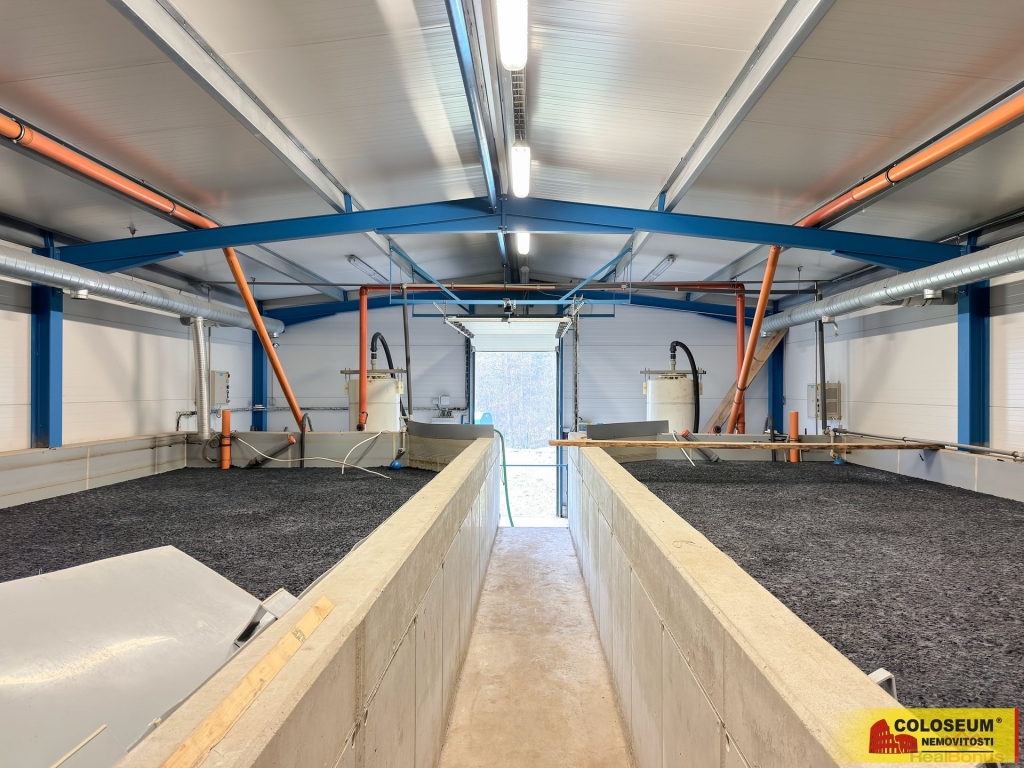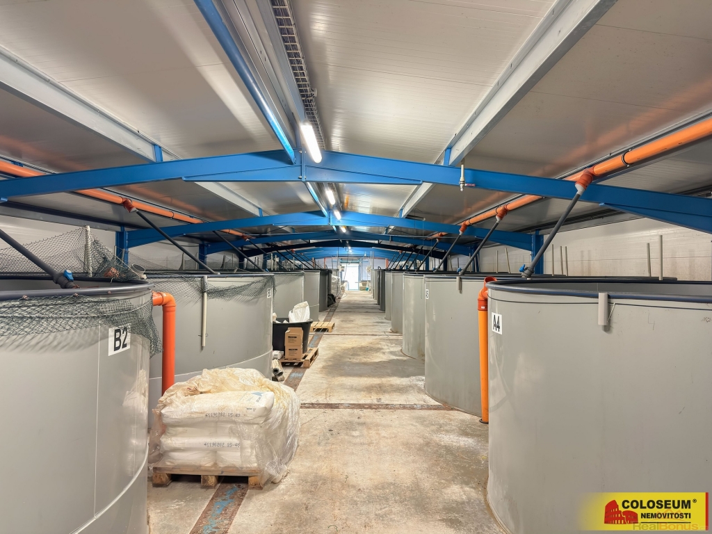 V hale je umístěna technologie pro odchov ryb a 4 funkční vysokokapacitní biologické čističky. Objem chovných nádrží je přibližně 530 m?, objem biofiltrů s bioelementy je přibližně 280 m?. Množství vody je dostatečné k jakémukoliv chovu ryb. Vybavení je součástí prodeje. V případě zájmu může být po dohodě s majitelem demontováno a hala bude předána kompletně vyklizená.