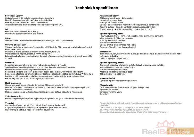 Vybavení bytu obsahuje plně vybavenou koupelnu, podlahy, osazení zárubní a dveří. Zvolené materiály jsou vybrány ve vysoké kvalitě a spolehlivosti. Vytápění bytu bude prostřednictvím teplovodního podlahového topení. Dodávku tepla bude zajišťovat společná kotelna. Podrobnější technickou specifikaci zašleme na přání zákazníka.