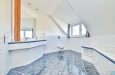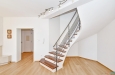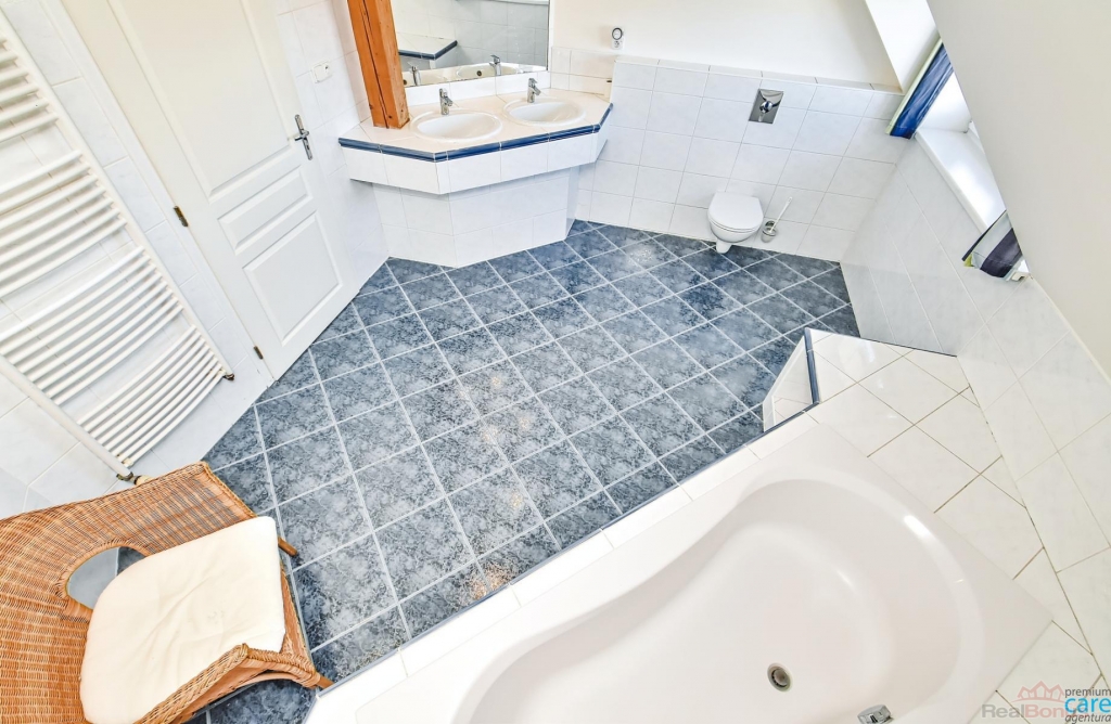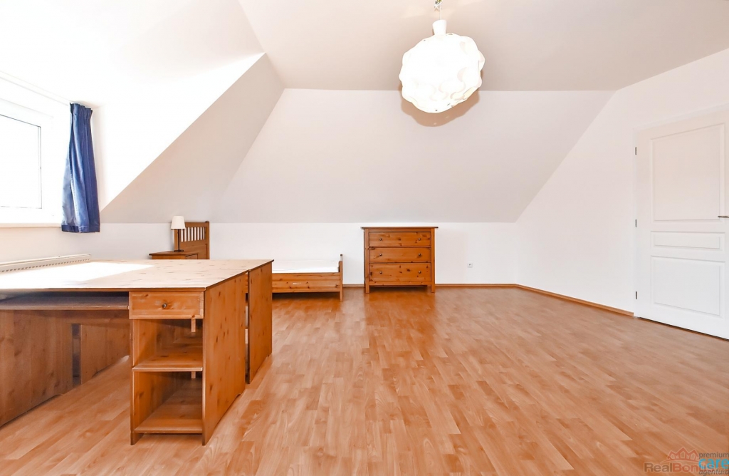 Po elegantním schodišti se dostanete do klidové části domu. Zde se nacházejí tři velké ložnice, prostorná galerie vhodná jako pracovna či relaxační zóna a koupelna s vanou.