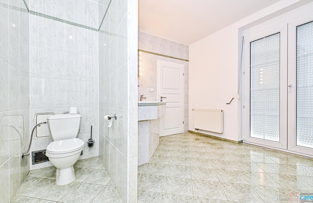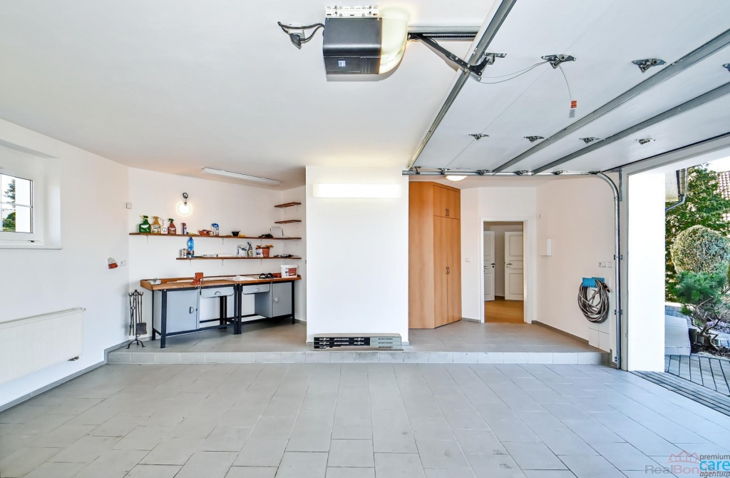 V přízemí se dále nachází vstupní předsíň, technická místnost, koupelna se sprchovým koutem s přípravou na saunu a také prostorná garáž pro dvě auta o velikosti 48 m and sup2;, ve které je prakticky vybudovaný pracovní kout a vestavěné úložné prostory.