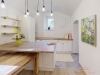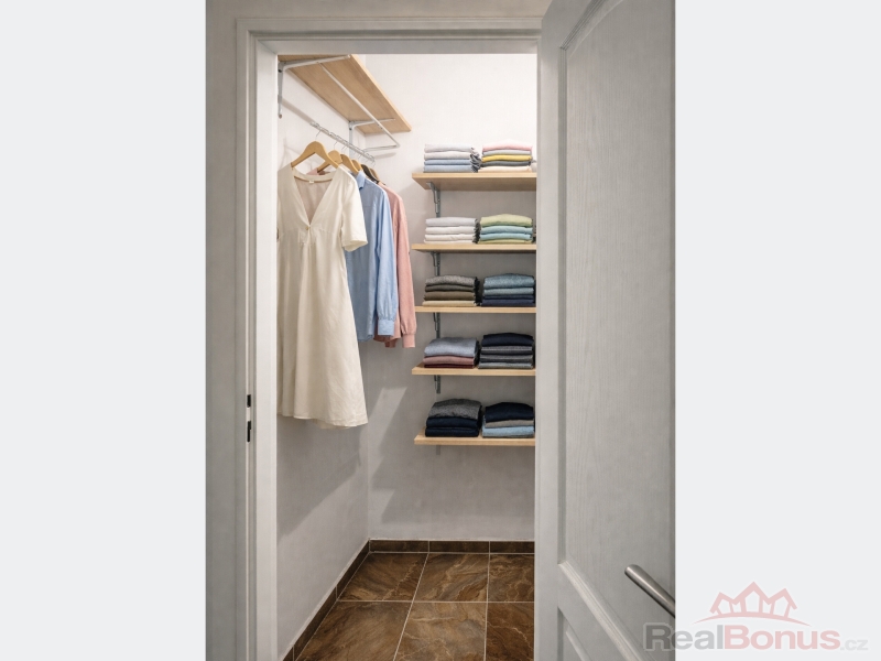 Z chodby vcházíme do velkorysého obývacího prostoru (28 m2) s klenutými stropy, jenž je aktuálně ložnicí s obývací částí, je však možnost jej přepažit a docílit tak dvou samostatných pokojů. Pokračujeme do prostoru s kuchyní a jídelnou (kuchyňská linka s ostrůvkem včetně vestavěných spotřebičů) komunikující se zahradou osvětlenou odpoledním sluncem. Samostatným vstupem z chodby se přesouváme do originálně řešené útulné koupelny, či na samostatné WC. Byt disponuje též praktickou šatnou a úklidovou komorou.