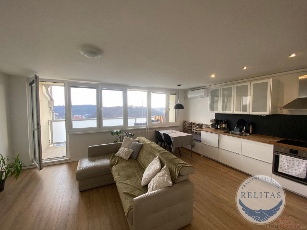 Exkluzivně zprostředkuji pronájem zrekonstruovaného a klimatizovaného bytu 3+kk, 66,9 m + 8 m lodžie ve 4. patře nově zateplené panelové budovy v ulici Družstevní ochoz, Praha 4 Michle. Byt se sestává z obývacího pokoje s kuchyňskou linkou s indukční deskou, koupelny s vanou, dvou neprůchozích ložnic a komory. Díky vysokému podlaží je z lodžie krásný výhled na protější zalesněný Tyršův vrch. Obývací pokoj s nově rozšířenou lodžií je orientovaný na východ, obě ložnice na západ a jsou vybaveny venkovními elektrickými žaluziemi.